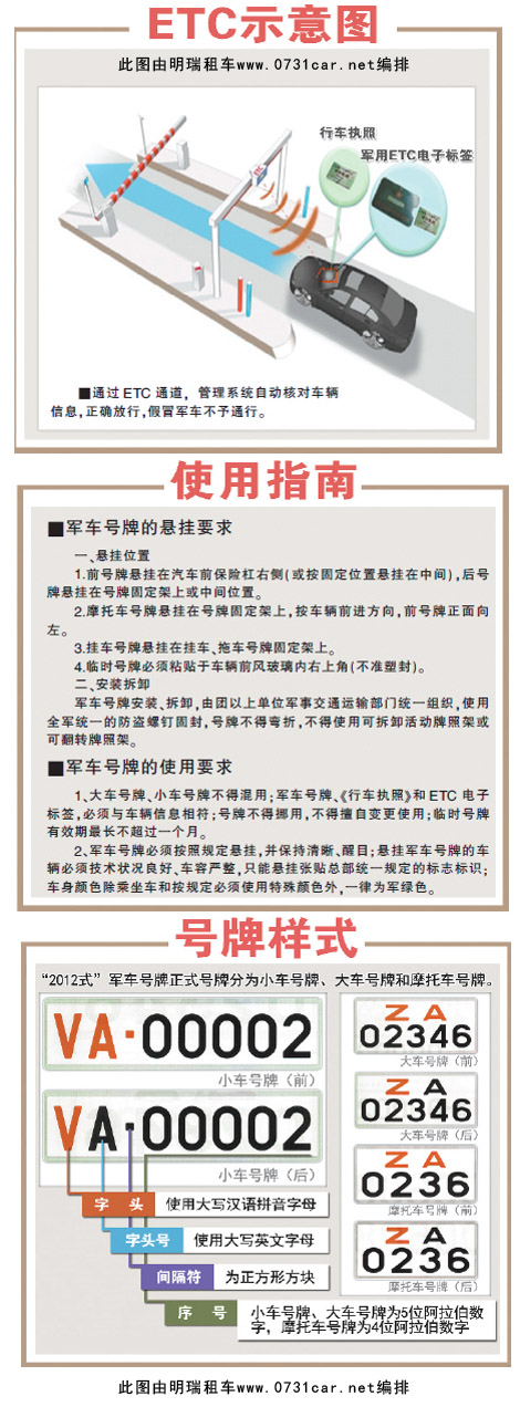 經(jīng)中央軍委批準,全軍和武警部隊將從2013年5月1號起統(tǒng)一使用新式軍車號牌,“2004式”軍車號牌即行廢止。軍車號牌是全軍軍用車輛的標志,是軍交運輸部門經(jīng)對申領號牌的車輛進行審核、檢驗、登記后核發(fā)的有注冊登記編碼的號碼牌,是國家賦予軍車運行特殊權利的證明。新式號牌與以往號牌相比,科技含量更高,防偽技術更新,采用了信息防偽、熒光防偽、3D光學防偽、激光三維隱爍防偽、激光刻印編碼防偽、軋印特殊花紋防偽等6項技術,還應用了ETC技術,既能更好地加強軍車管理,又可有效防范假冒軍車。