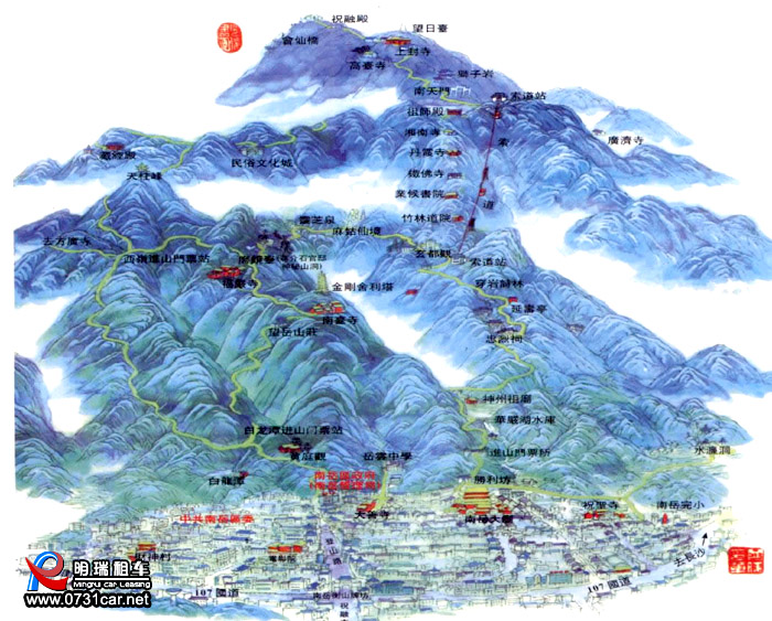 7.開(kāi)車經(jīng)京珠高速,從衡山風(fēng)景區(qū)路口下高速(新塘出口),然后經(jīng)衡東新塘鎮(zhèn),過(guò)衡山湘江大橋,直走至107國(guó)道,再往南走20分鐘即到(有非常明顯的指路牌,請(qǐng)留意);京珠高速直達(dá)南岳的南岳高速連接線正在建設(shè)中,預(yù)計(jì)2012年可以完工,屆時(shí)京珠高速可直接轉(zhuǎn)南岳高速到達(dá)南岳衡山。