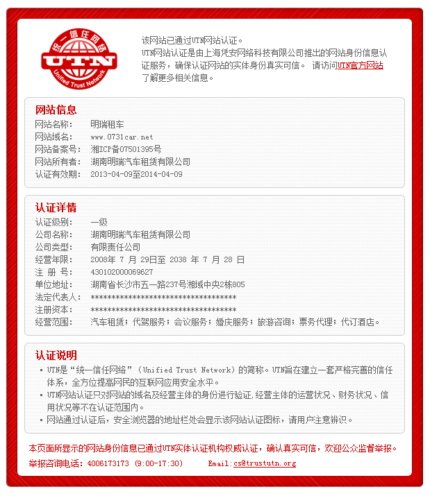 長(zhǎng)沙租車明瑞公司為了讓廣大客戶對(duì)本公司的信任,特向統(tǒng)一信任網(wǎng)進(jìn)行認(rèn)證,在嚴(yán)格的審核下,本公司通過了UTN認(rèn)證,依托政府有關(guān)政策支持,建立嚴(yán)格完善的互聯(lián)網(wǎng)信任體系。